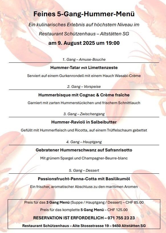 Gedämpft, gegrillt oder gebraten. Wir setzen einen ganzen Hummer als Köstlichkeit in 3 oder 5 Gängen und gekrönt von einem Sorbet in Szene!